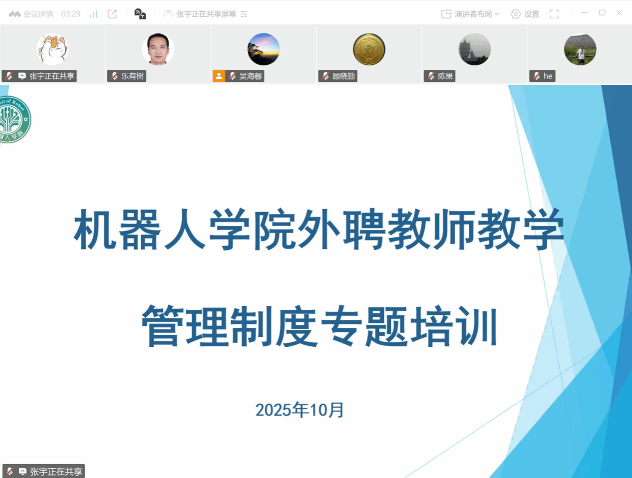 10月21日,机器人学院以线上会议形式召开外聘教师教学管理制度专题培训,深入推进学校教风学风建设月活动,严把教学质量关。会议由学院副院长乐有树主持,专业负责人、专业助理教师、全体外聘教师及教务员参会。