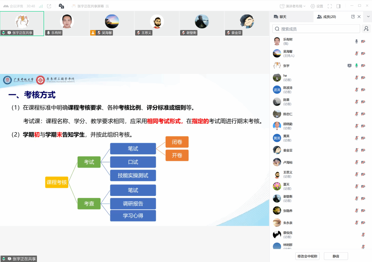 培训紧扣教风学风建设核心要求,首先系统介绍学校教风学风建设月活动的目标与部署,明确外聘教师在教学质量提升、学风引导中的关键作用。随后,培训围绕教学管理制度展开重点学习:王思义老师解读《广东开放大学(广东理工职业学院)外聘兼职兼课教师管理办法》,明确外聘教师的权责边界与管理规范;姜金亚老师讲解《广东理工职业学院教师课堂教学规范(修订)》,从教学准备、课堂组织到课后反馈,细化教学各环节标准;张宇老师梳理《广东理工职业学院学生课程考核工作管理办法》,强调考核公平性与育人导向。