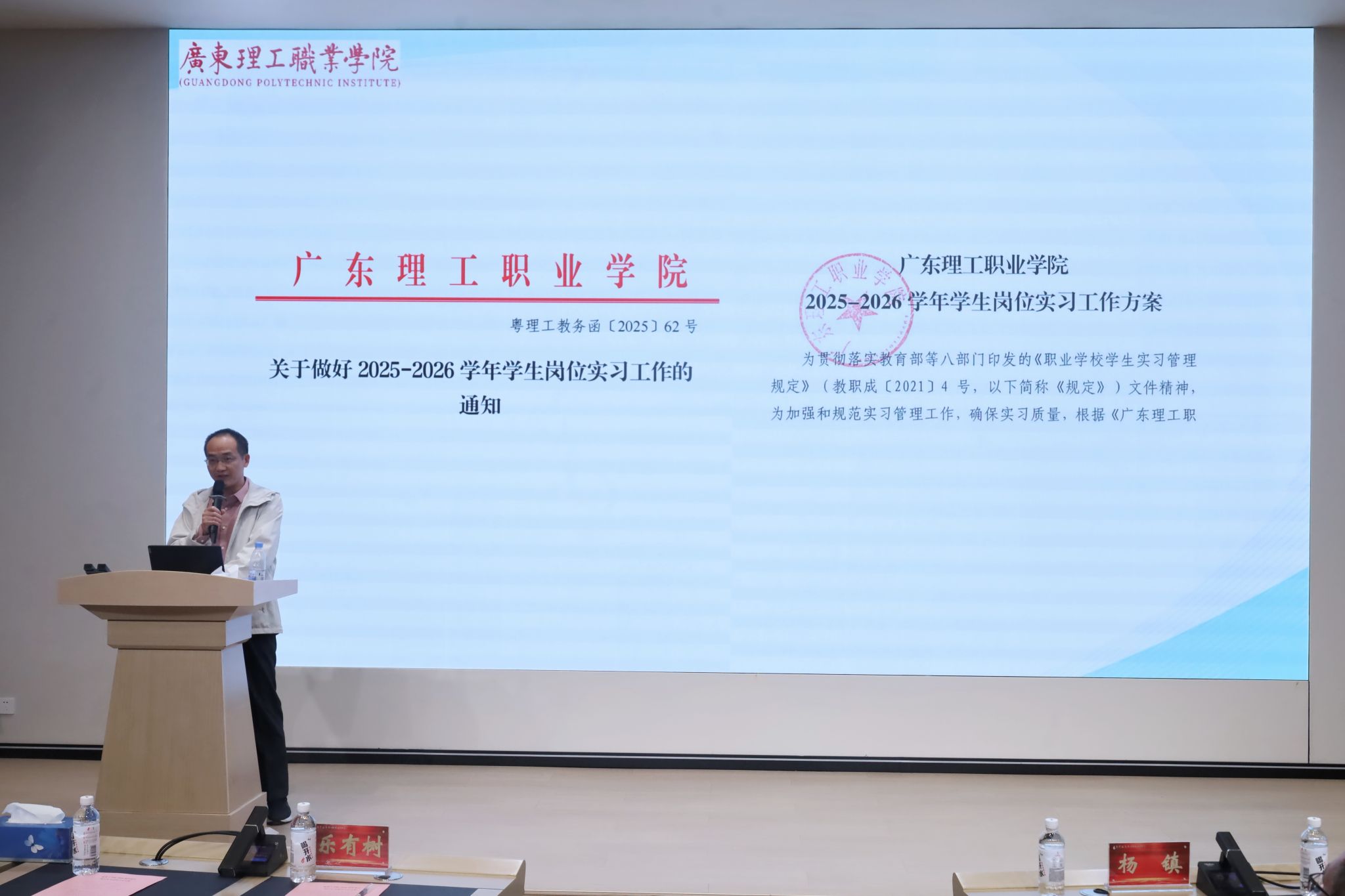副院长乐有树作岗位实习动员并对相关重点进行详细介绍,他从实习时间与前期准备、岗位要求与过程管理、实习总结与评价等方面进行了说明,强调岗位实习是一门20学分的综合实践类课程,希望同学们认真对待。他梳理了岗位实习过程中指导老师和学生分别需要完成的任务,并对岗位实习近期准备工作进行了部署。